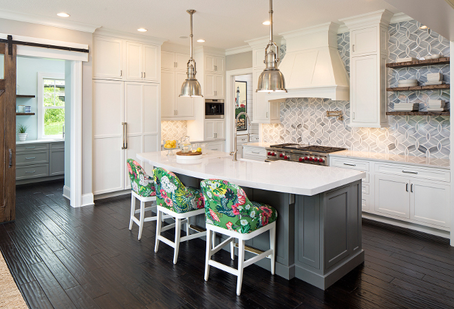 The charcoal grey kitchen island paint color is Kendall Charcoal HC-166 Benjamin Moore.